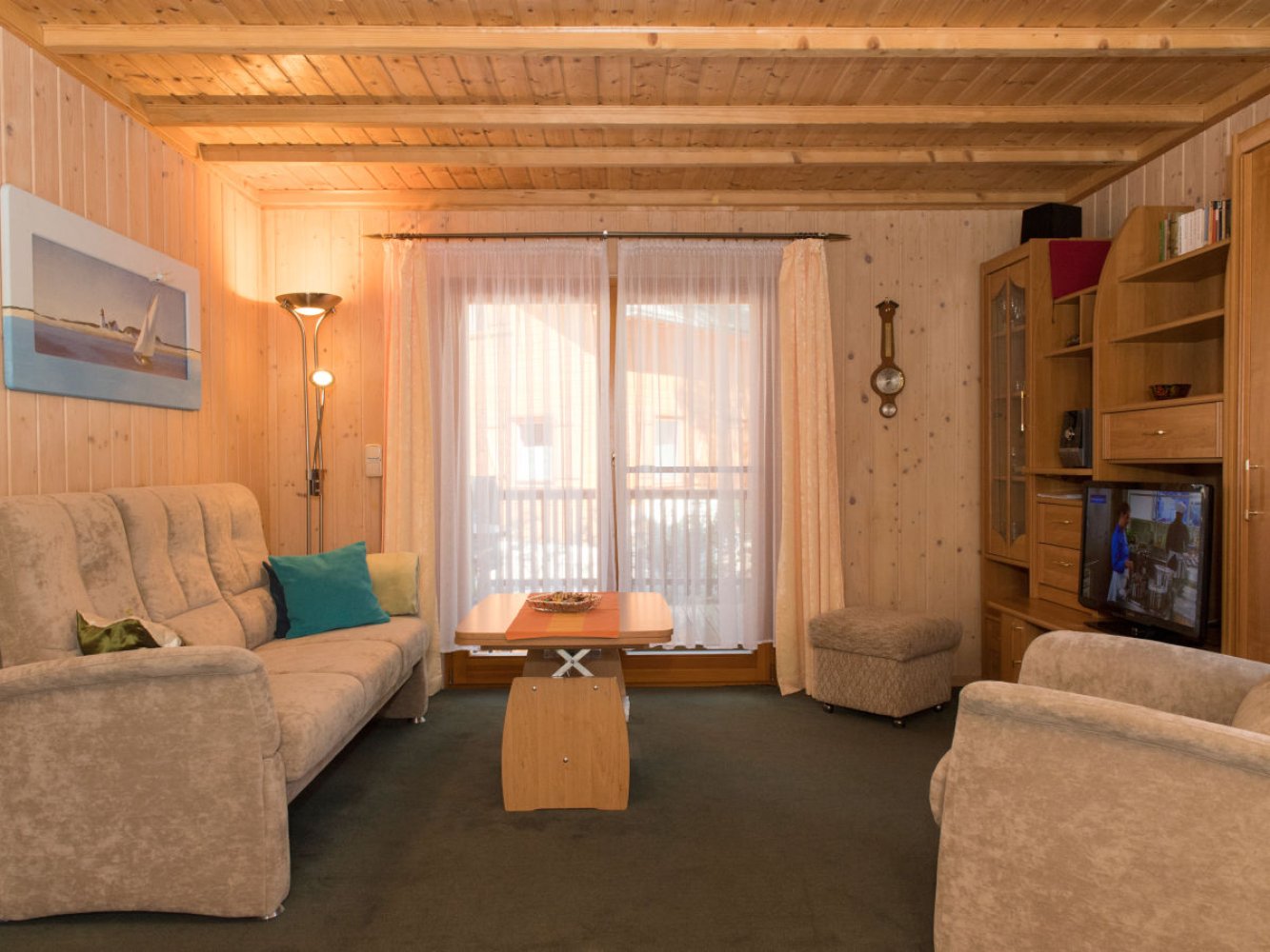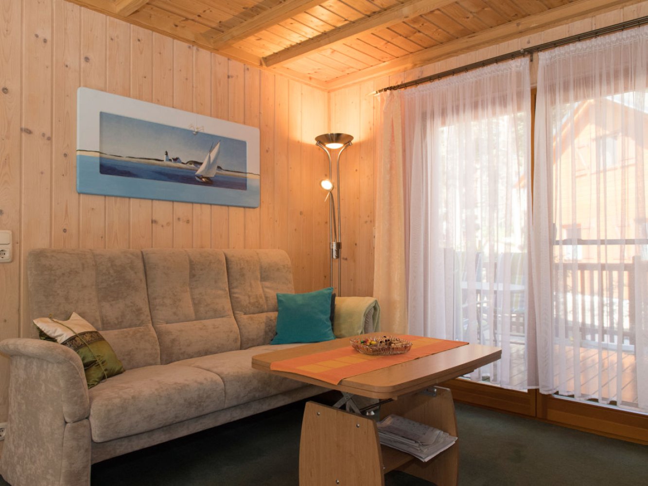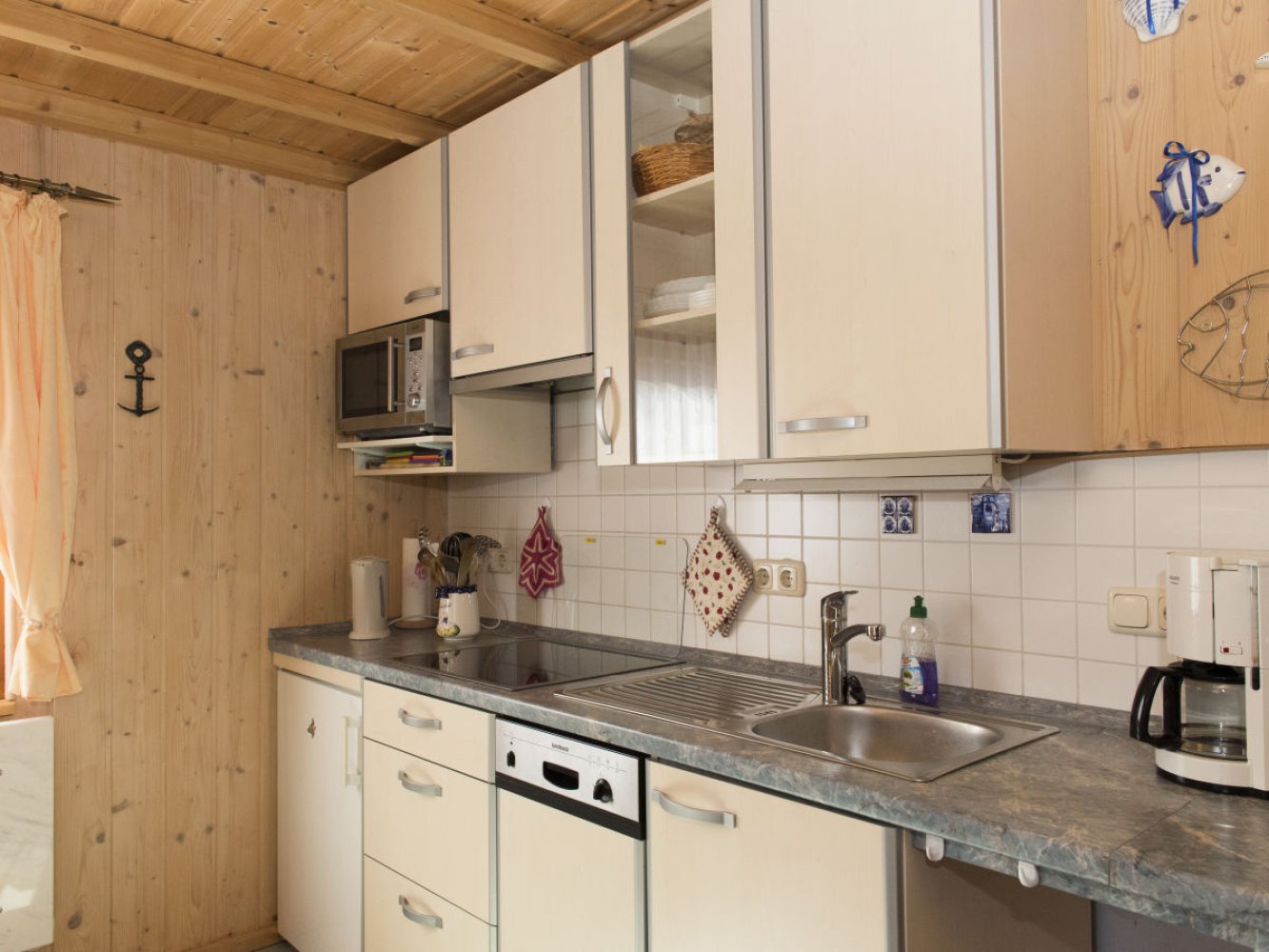 Unser komfortabel und modern eingerichtetes Nichtraucher - Holzhaus etwa 80 Meter vom Strand entfert ist ganzjährig nutzbar und bietet Ihnen auf ca. 70 m² für 6 Personen (4 Erwachsene und Kinder) ein komplett möbliertes Wohnzimmer, kombiniert mit Essecke und voll ausgestatteter Küchenzeile, u.a. mit Geschirrspüler, Cerankochfeld, Mikrowelle und Kühlschrank, Flur mit vollwertiger Treppe zum Obergeschoss sowie ein Bad mit Fußbodenheizung, DU und WC im Erdgeschoss.