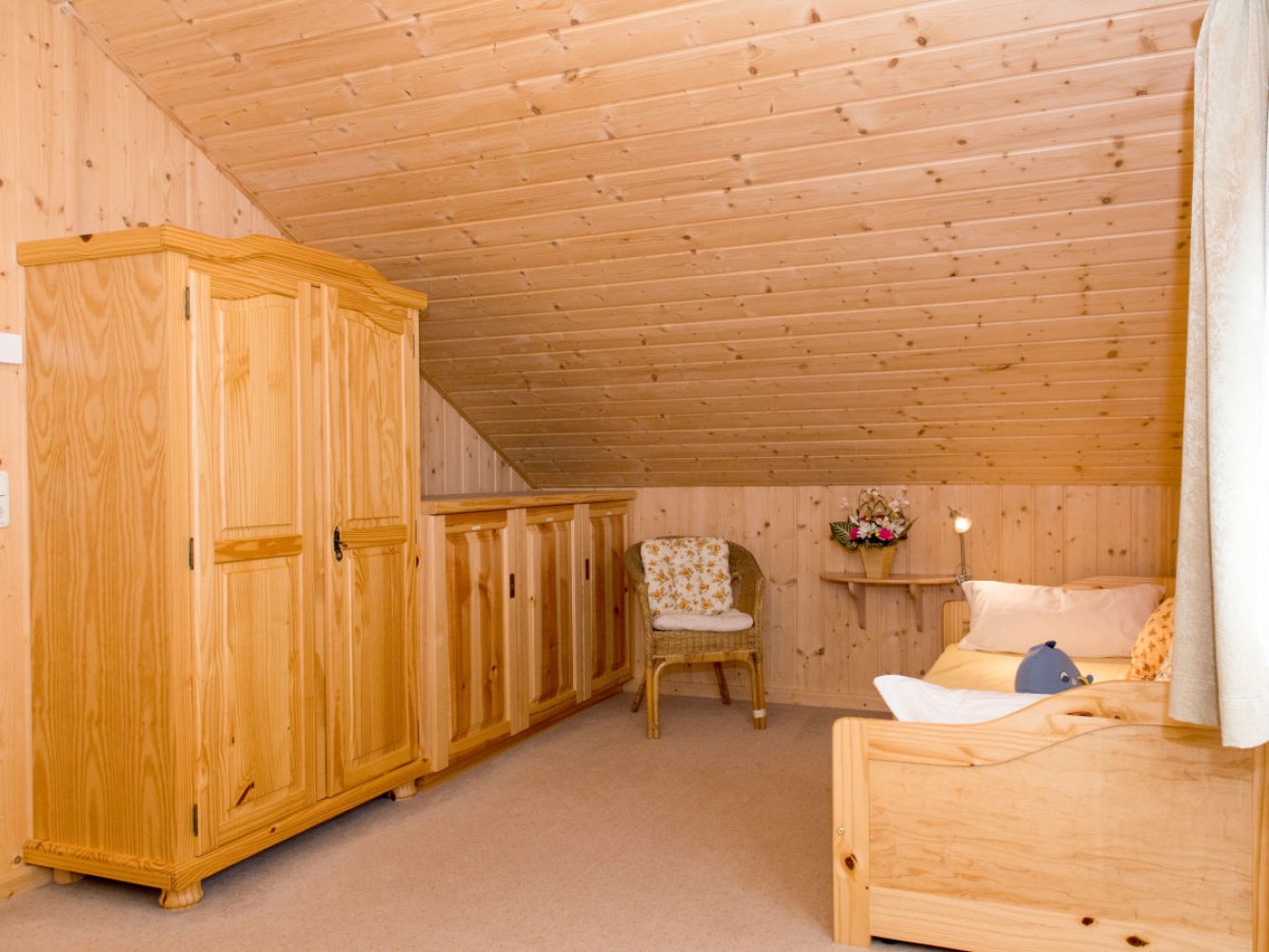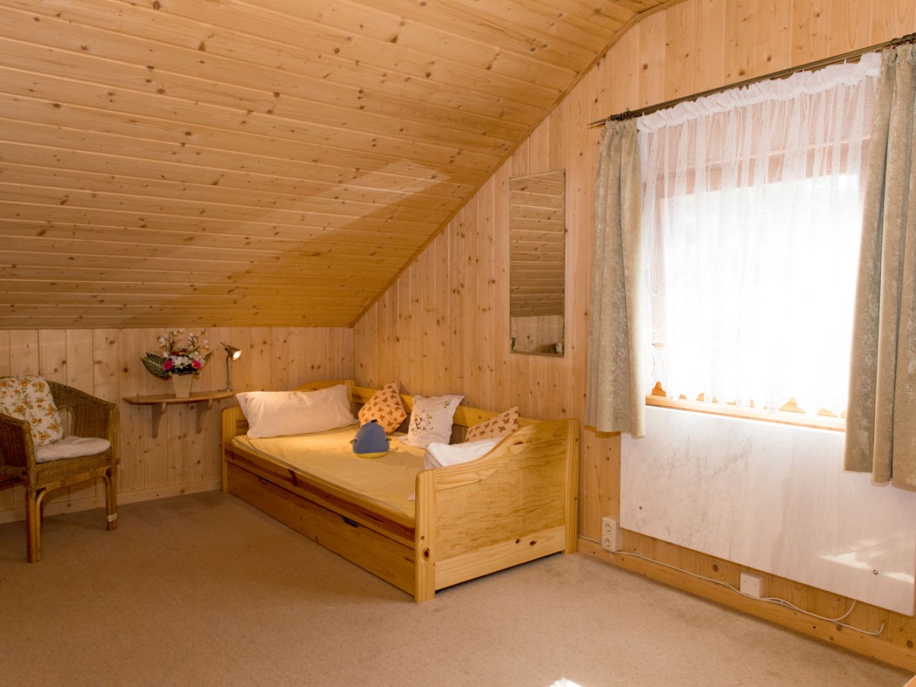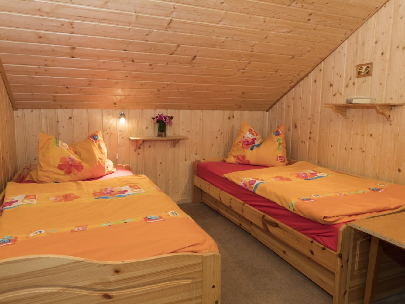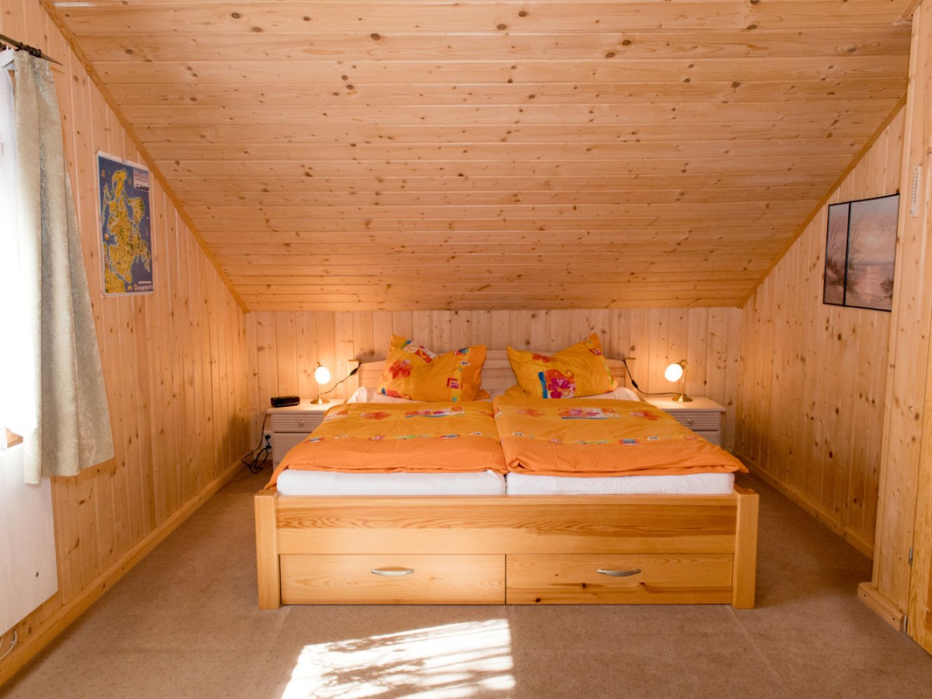 Im Obergeschoss befinden sich zwei Schlafzimmer mit jeweils einem großem Doppelbett (gesamt 4 Betten und 1 Aufbettung möglich)