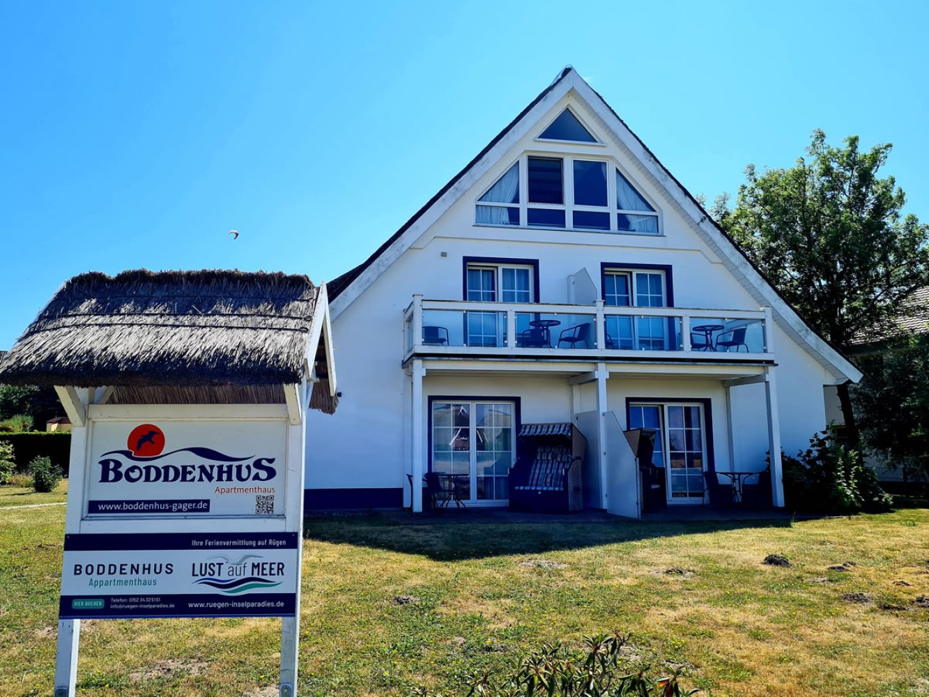 Wir begrüßen Sie sehr herzlich in Ihrer Ferienwohnung im Boddenhus und wünschen Ihnen einen erholsamen Aufenthalt. Wir haben uns bemüht, Ihre Ferienwohnung attraktiv und modern auszustatten und alles bereit zu stellen, damit Sie schöne Ferientage genießen können. In den Jahren 2017 und 2018 haben wir für Sie renoviert. Unser Haus auf dem 3.000 m2 großen Grundstück mit Strandkörben und Grillplätzen liegt direkt an der Hagenschen Wiek. Bis zum Ostseestrand von Gager sind es 2.000 m oder 10 Minuten mit dem Fahrrad.