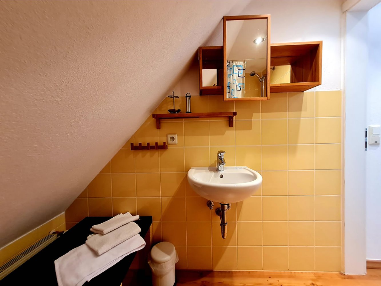 Bei der Ferienwohnung Windrose handelt es sich um ein Ein-Raum-Appartement im Dachgeschoss - ideal für 1 bis 2 Personen. Die Wohnung verfügt über ein Schlafsofa für 2 Personen. Das große Panoramafenster ist zu den Zickerschen Alpen ausgerichtet. Im Appartement befindet sich eine Klimaanlage. Die Fewo hat eine kleine Küchenzeile, ausgestattet mit Kühlschrank (mit Eisfach), Backofen und Herd sowie Geschirrspüler. Weiter stehen Toaster, Kaffeemaschine, Mikrowelle zur Verfügung. Das Bad ist klein aber separat, mit Dusche, WC und Waschbecken.