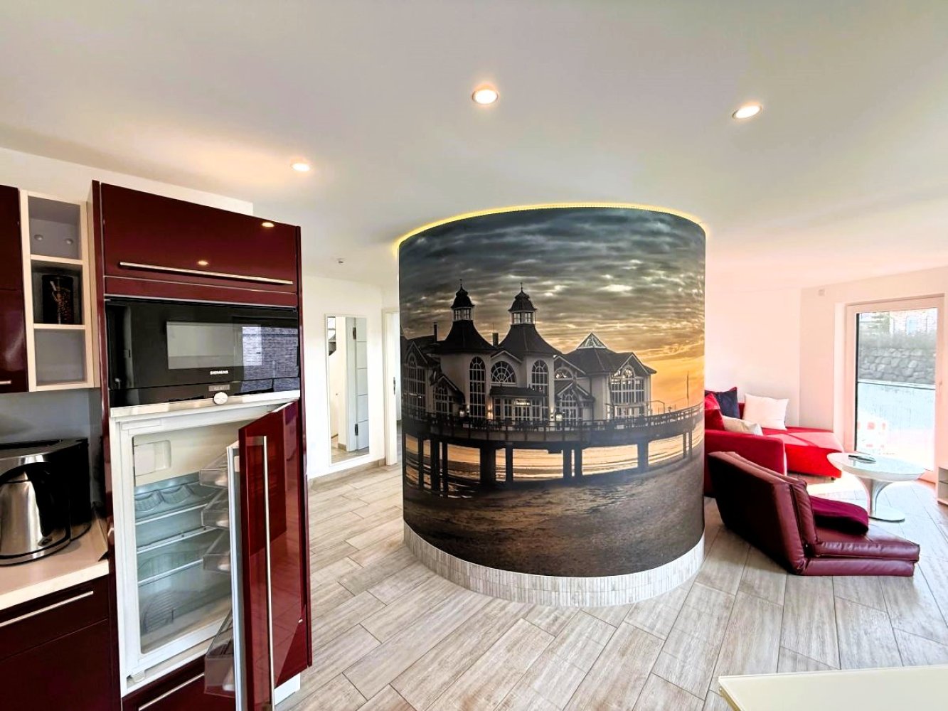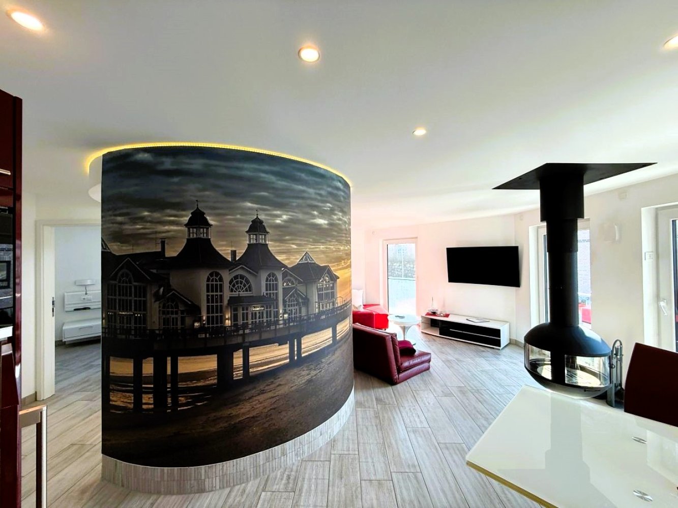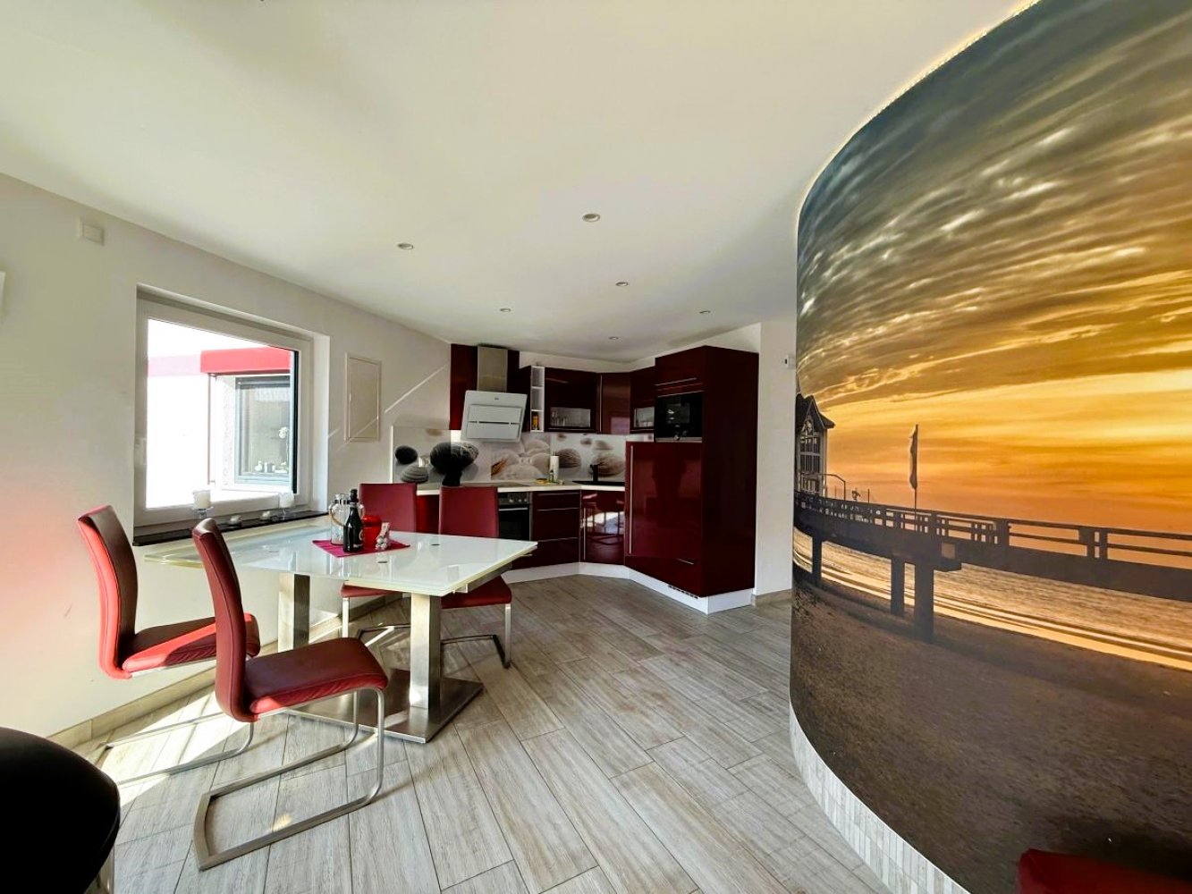 In der hochwertigen Küche finden Sie alle Küchengeräte für ein entspanntes Kocherlebnis. Das Wohnzimmer ist gemütlich mit einem hängenden Kamin ! Ein besonderes Erlebnis für Kaminliebhaber ! Wir bitten um Beachtung, dass wir kein Kaminholz zur Verfügung stellen. Das Bad verfügt über eine Wanne mit Dusche, WC und Waschtisch. Weiter bietet die Ferienwohnung kostenloses WLAN, Grillmöglichkeiten, eine Dachterrasse mit Bestuhlung, sowie einem kostenlosen Privatparkplatz direkt am Objekt. Der große weiße Sandstrand sowie die berühmte Selliner Seebrücke mit ihrem Restaurant und der Tauchgondel sind nur unweit entfernt.