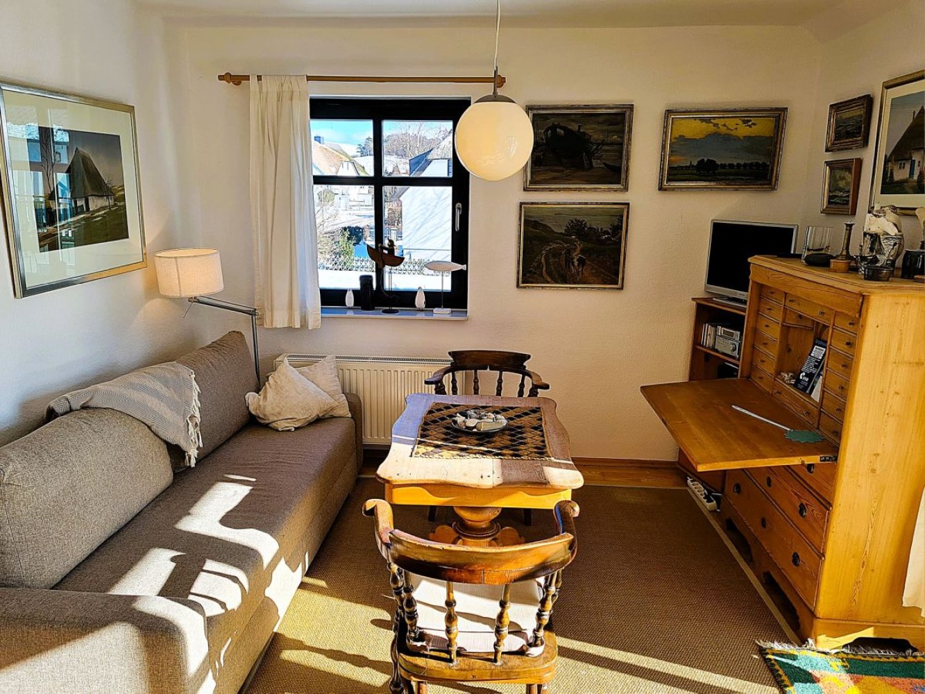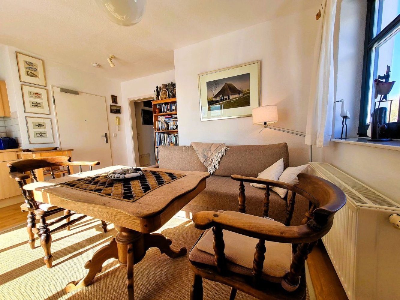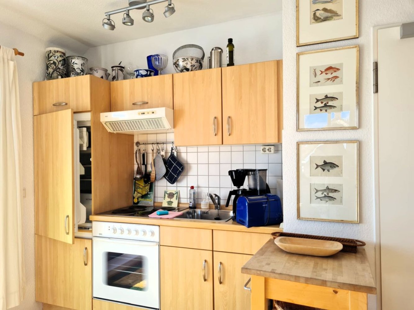 Die Fewo besteht aus einem Wohn- und Essraum. Von hier aus können Sie auf den Balkon und den schönen direkten Wasserblick genießen. Das WoZi verfügt über eine Couch, einen Esstisch und zwei Stühle sowie einen TV und Radio. In der Küchenzeile sind neben dem 4 Plattenherd auch ein Wasserkocher, Kaffeemaschinen, Kühlschrank, Eisfach, Toaster und Backofen zu finden. Das separate Schlafzimmer verfügt über ein Doppelbett. Im Bad sind Waschbacken, WC und Dusche sowie ein Fenster mit Tageslicht.