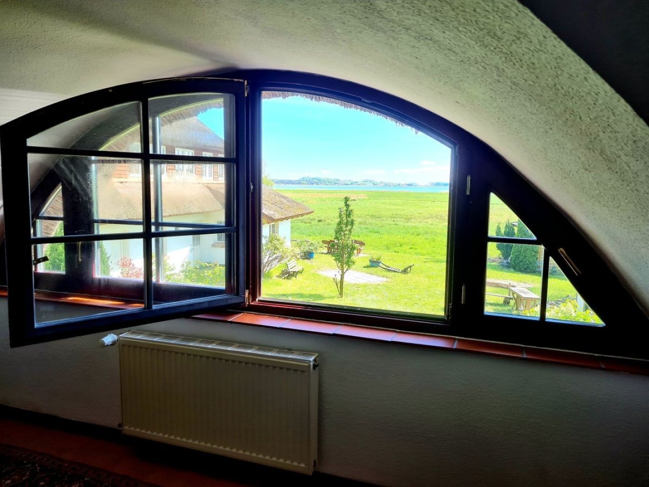 Beim betreten der Ferienwohnung im Erdgeschoss bietet Ihnen im unteren Bereich der großräumige Flur mit Schrank bereits umfangreich Möglichkeiten ihre Reisetaschen gut und ordentlich zu verstauen. Über eine stabile und genormte Holztreppe erreichen Sie das Obergeschoss. Hier befinden sich das große Wohnzimmer und der Küchenbereich. In beide Richtungen verfügt die Fewo über zwei große reetgedeckte Gauben. Im Wohnzimmer können Sie direkt über die mondänen Salzwiesen auf das Wasser blicken - unverbaut und romantisch schön. Im Wohnzimmer gibt es ein gemütliches Sofa sowie einen Sessel zum Klönen. Weiter haben Sie einen TV und das Objekt verfügt über kostenfreies WLAN. Im Küchenbereich finden Sie alle Utensilien, die sie für ihren Gaumenschmauss benötigen.