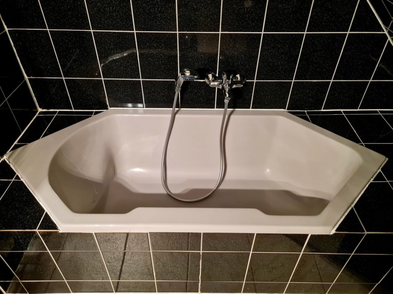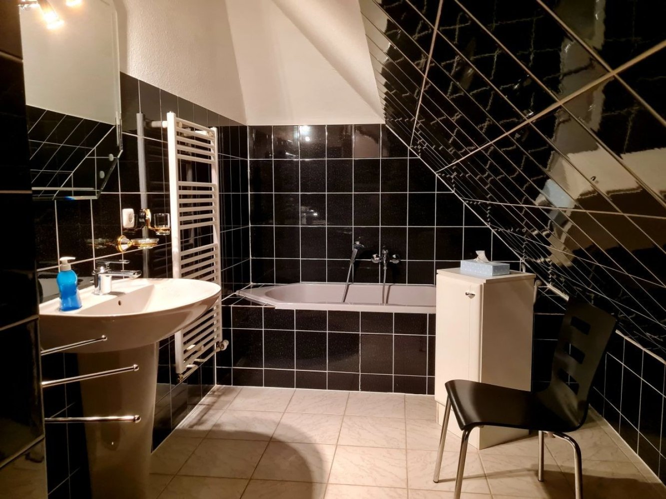 Das Bad schließt an das Elternschlafzimmer an und hat eine Wanne mit Dusche, WC und Waschtisch.