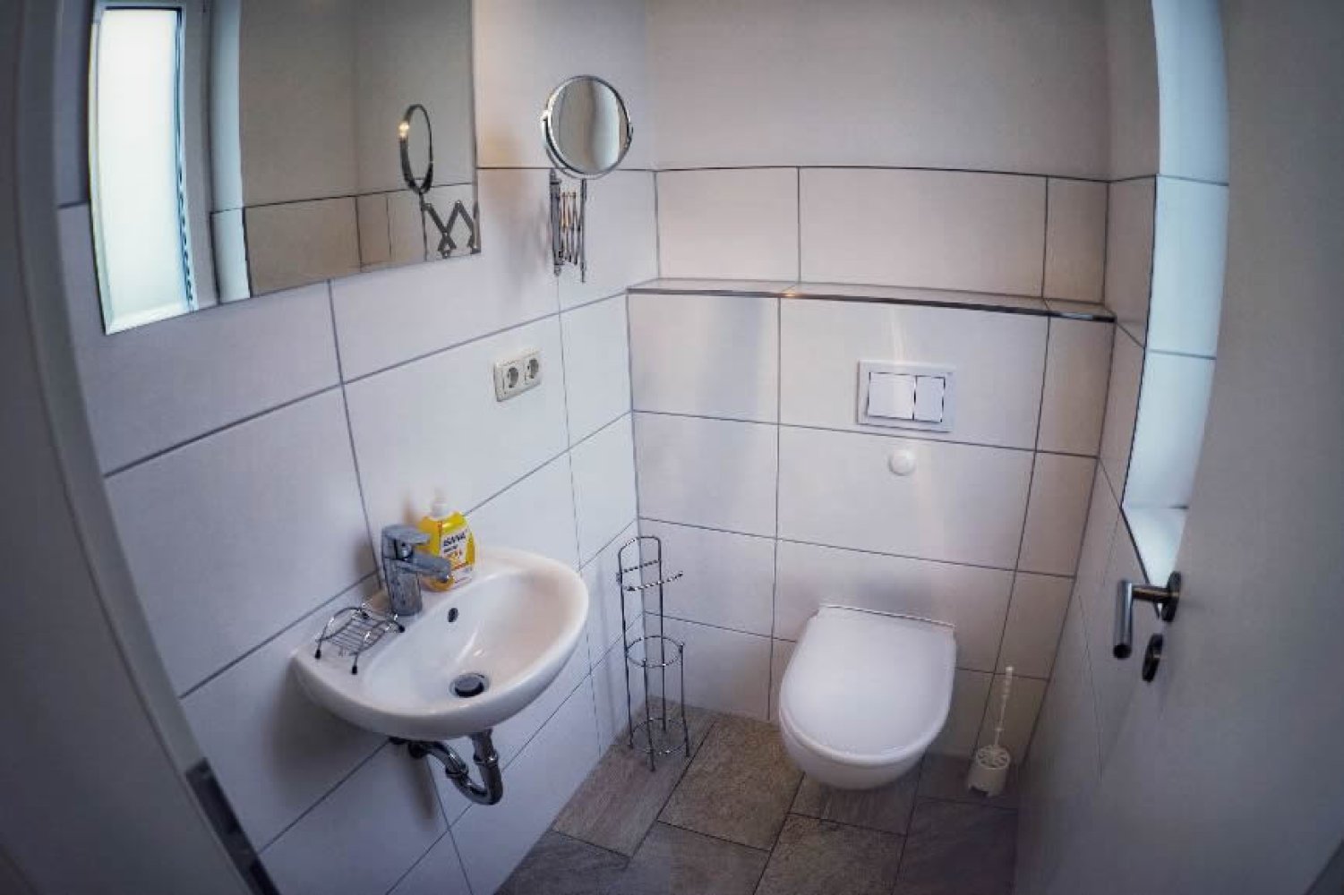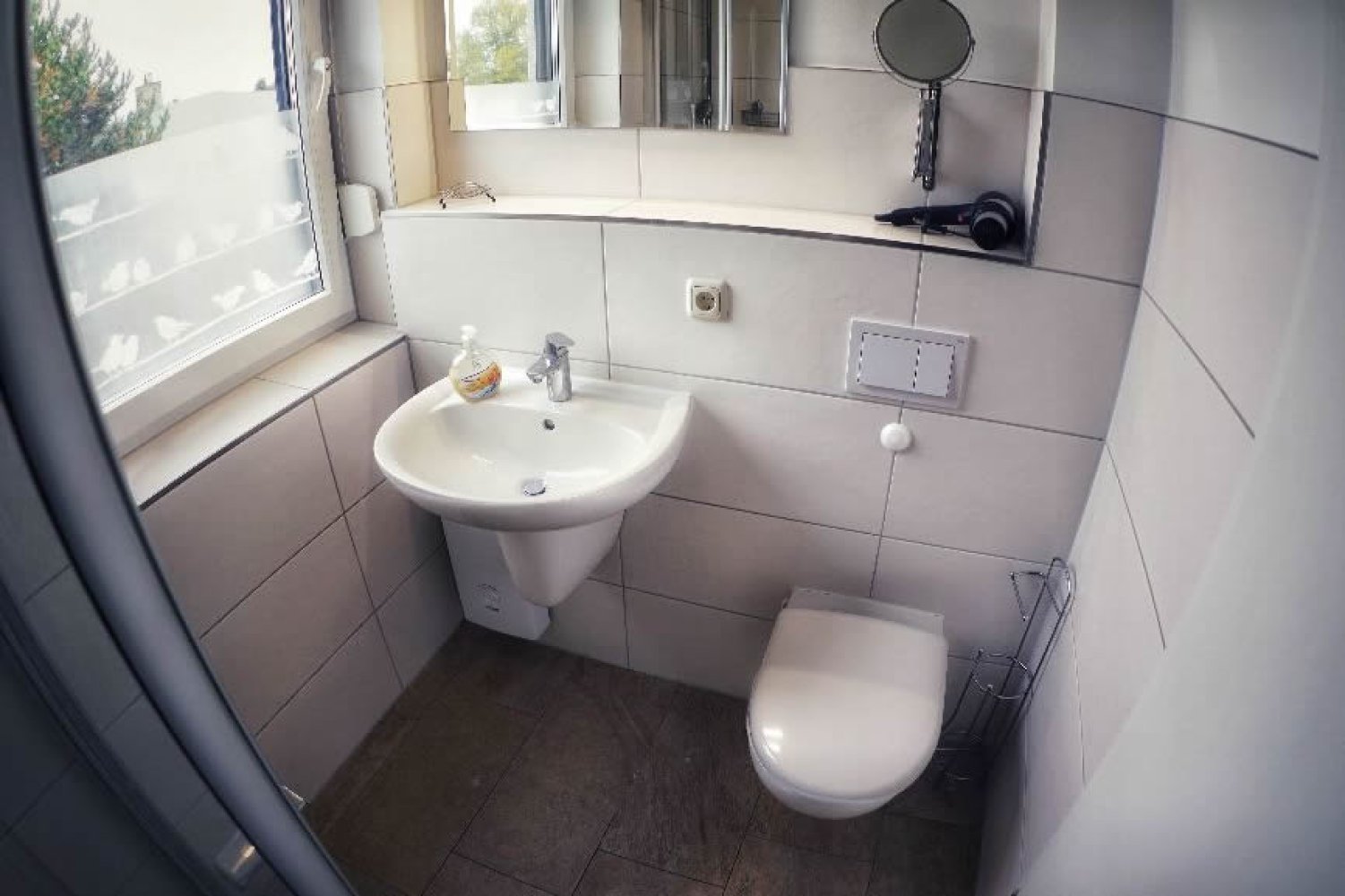 Das Bad im Obergeschoss hat eine ebenerdige Dusche, WC, Fenster und verfügt über einen Handtuchtrockner, Waschtisch und Fön.
