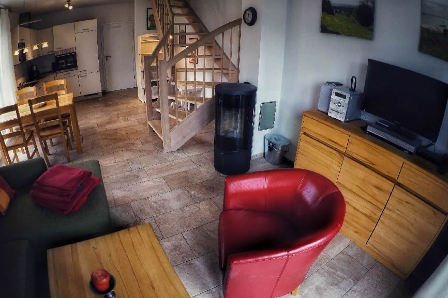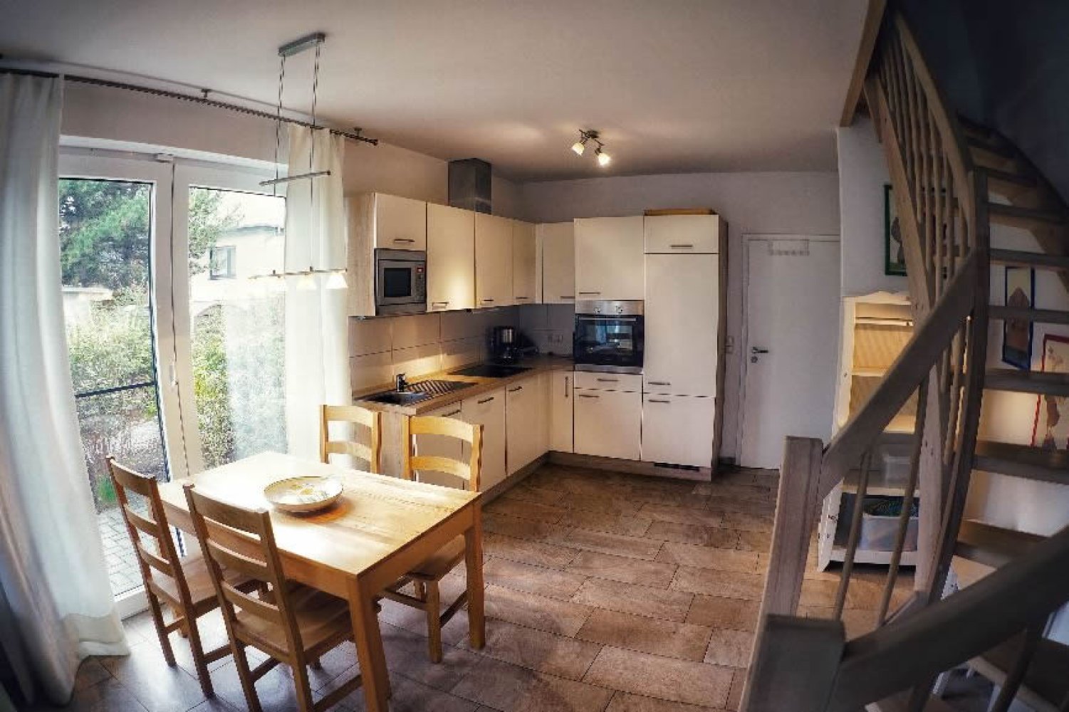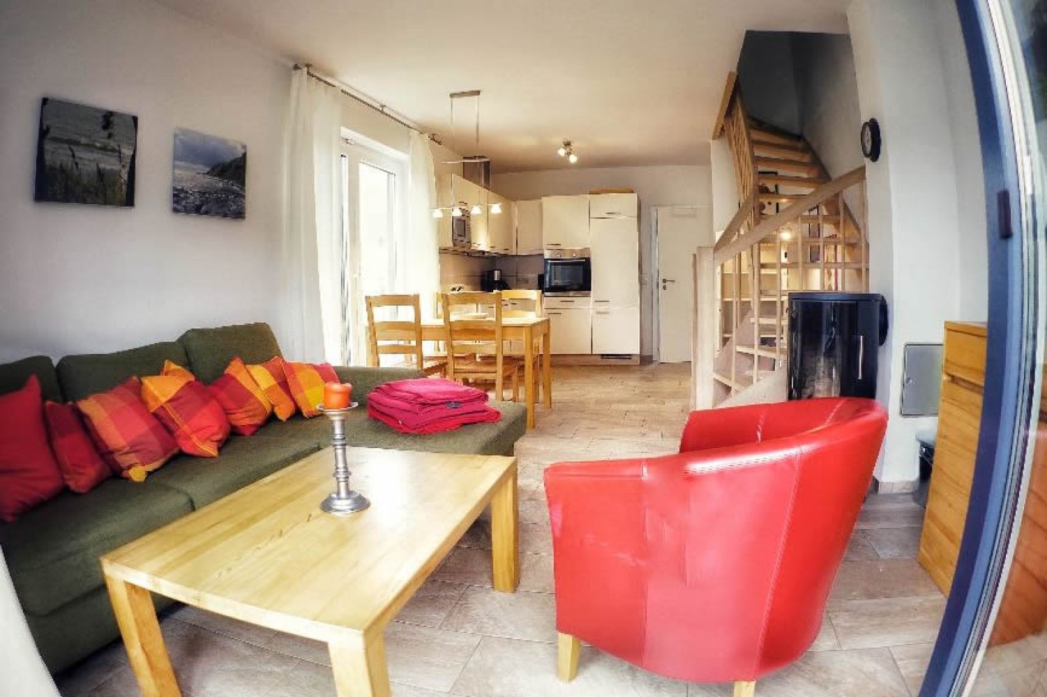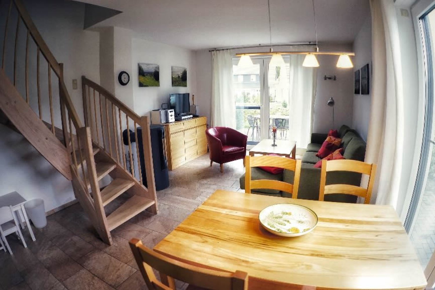 Die 2014 fertig gestellte großzügige 3 – Raumwohnung (Nichtraucher) mit guten 62 qm hat eine Süd- und eine Westterrasse mit cr. 28 qm und ist im Landhausstil ausgestattet. Sie ist für 4 Personen (inkl. 2 Kleinkindern) gut geeignet. Alle Räume haben Fußbodenheizung, die Fenster sind mit Rollos und Fliegengittern versehen. Wohn-, Essbereich und ein Gäste WC befinden sich im Erdgeschoss sowie ein schöner Kamin. Wir bitten um Beachtung, dass wir kein Kaminholz zur Verfügung stellen. Im Obergeschoss finden Sie ein Schlafzimmer mit Doppelbett (getrennte Matratzen), großem Einbauschrank, Schreibtisch sowie ein Schlafzimmer mit Stapelbett (getrennt nutzbar). Zuzüglich verfügt die Fewo über zwei Kinderreisebetten samt Kommode und Wickelaufsatz. Die Treppe in das Erdgeschoss ist mit einer Kindersicherung versehen.